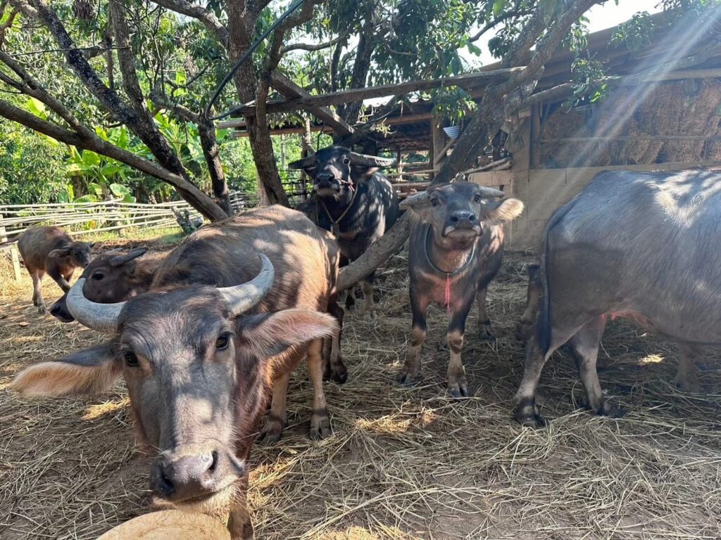 วันที่ 2 ธันวาคม 2567 เวลา 09.30 น. นายนิยม สุวรรณประภา หัวหน้าสำนักงานกองทุนฟื้นฟูและพัฒนาเกษตรกร สาขาจังหวัดเชียงราย (กฟก.) มอบหมายให้ นางสุกัญญา แสงหล้า พนักงานอาวุโส นางสาวจุฑาทิพย์ ปินตาสาร และนางสาวกัญนมนต์ จันทร์ภิรภูพัชร ลูกจ้างกลุ่มงานทั่วไป ลงพื้นที่ร่วมส่งมอบกระบือแม่พันธุ์ จำนวน 15 ตัว งวดที่ 2 (งวดสุดท้าย) ขององค์กรเกษตรกร กลุ่มเกษตรกรทำนาหนองแรด โดยมีนายยุทธการ ยอดแก้ว นายสัตวแพทย์ชำนาญการ รักษาราชการแทนปศุสัตว์อำเภอเทิง สำนักงานปศุสัตว์อำเภอเทิง ร่วมลงพื้นที่ให้คำแนะนำการเฝ้าระวังและป้องกันโรคระบาดสัตว์ การดูแลสุขภาพสัตว์ การเสริมสร้างภูมิคุ้มกันโรคสัตว์ การจัดการอาหารสัตว์ การทำฟาร์มที่มีระบบการป้องกันโรคและการเลี้ยงสัตว์ที่เหมาะสม (GFM) ให้แก่เกษตรกร ผู้เข้าร่วมโครงการฯ ณ บ้านม่อนป่ายาง หมู่ที่ 5 ตำบลหนองแรด อำเภอเทิง จังหวัดเชียงราย