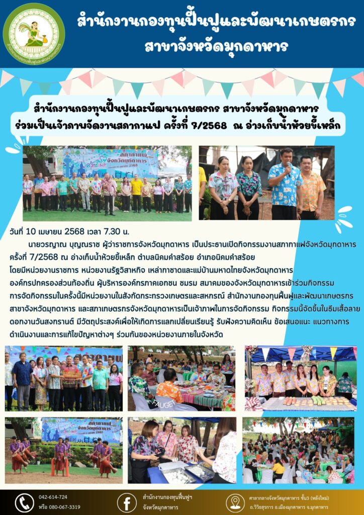 The post กฟก.มุกดาหาร ร่วมงานสภากาแฟจังหวัดมุกดาหาร ครั้งที่ 7/2568 ณ อ่างเก็บน้ำห้วยขี้เหล็ก ตำบลนิคมคำสร้อย อำเภอนิคมคำสร้อย จังหวัดมุกดาหาร appeared first on สำนักงานกองทุนฟื้นฟูและพัฒนาเกษตรกร สาขาจังหวัดมุกดาหาร.