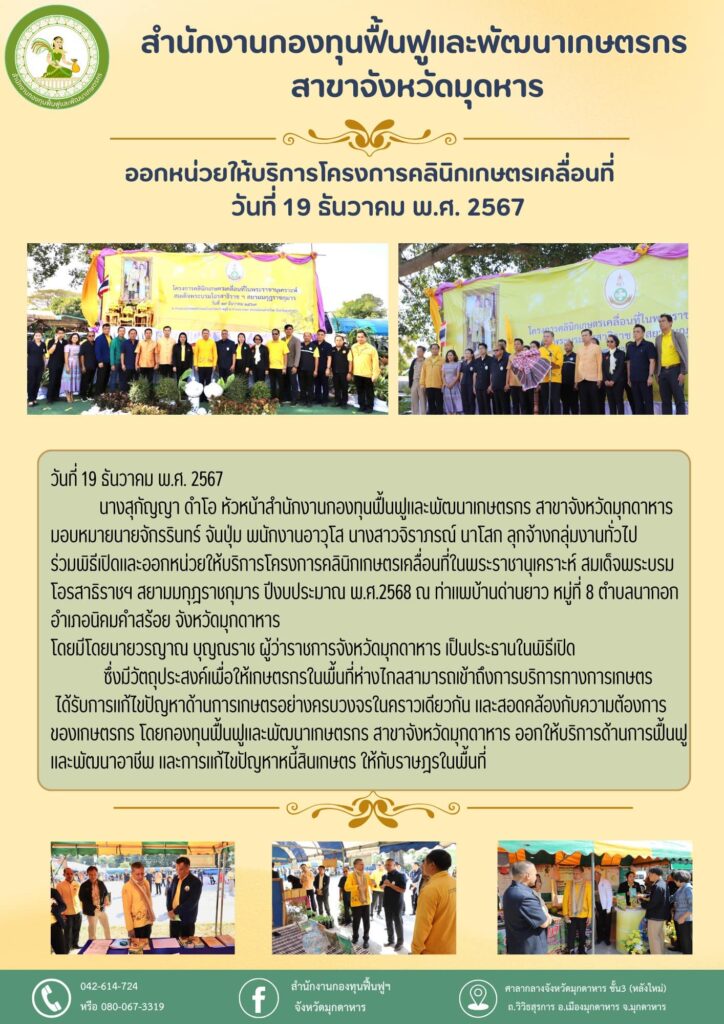 The post กฟก.มุกดาหาร ออกหน่วยให้บริการโครงการคลินิกเกษตรเคลื่อนที่ในพระราชานุเคราะห์ สมเด็จพระบรมโอรสาธิราชฯ สยามมกุฎราชกุมาร ปีงบประมาณ พ.ศ.2568 appeared first on สำนักงานกองทุนฟื้นฟูและพัฒนาเกษตรกร สาขาจังหวัดมุกดาหาร.