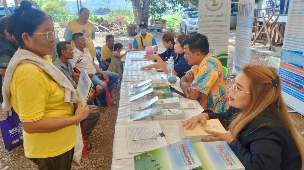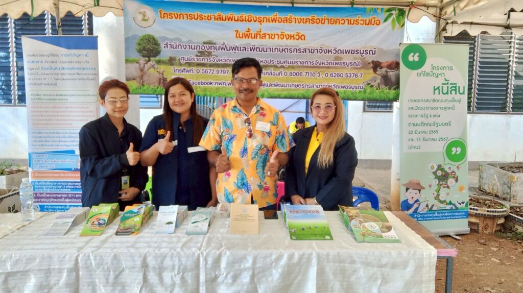 วันที่ 24 เมษายน 2568 นางสาวรชตวรรณ หมื่นสาย หัวหน้าสำนักงานกองทุนฟื้นฟูและพัฒนาเกษตรกร สาขาจังหวัดเพชรบูรณ์ มอบหมายให้ นางสาวฤทัยรัช เที่ยงอยู่ นางสาวปูณรา คงแสงสกุลวานิช เจ้าหน้าที่ ร่วมกับ นายสาคร พรหมชุลี และ นางนวพร พรหมชุลี อนุกรรมการจังหวัดเพชรบูรณ์ เข้าร่วมกิจกรรมในโครงการ หน่วยบำรุงทุกข์ บำรุงสุข สร้างรอยยิ้มให้ประชาชน ครั้งที่ 6/2568 เพื่อประชาสัมพันธ์เชิงรุกเพื่อสร้างเครือข่ายความร่วมมือในพื้นที่สาขาจังหวัด และการแก้ไขปัญหาหนี้สินเกษตรกรสมาชิก กฟก. โดย นายศรัณยู มีทองคำ ผู้ว่าราชการจังหวัดเพชรบูรณ์ เป็นประธานในพิธีฯ ณ วัดโนนสง่าบูรพาราม หมู่ 10 ตำบลยางสาว อำเภอวิเชียรบุรี จังหวัดเพชรบูรณ์