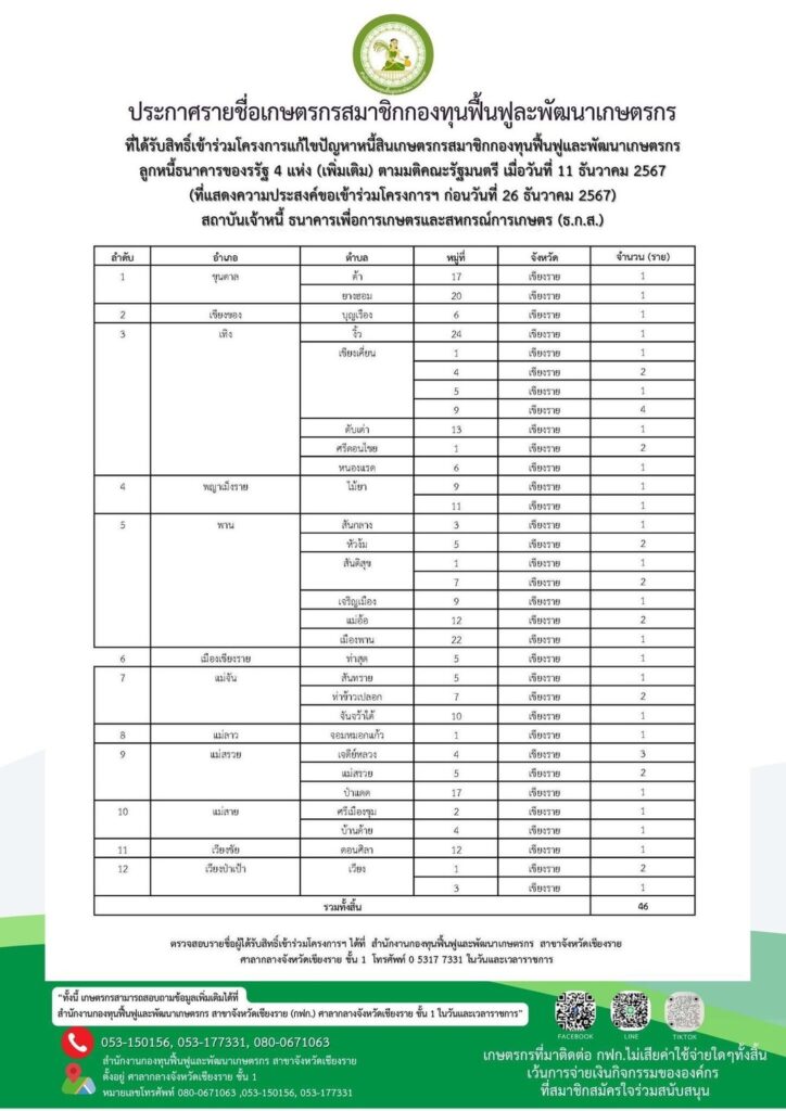 ทั้งนี้สำนักงาน กฟก.จังหวัดเชียงราย ได้ประสานแจ้งให้เกษตรกรตามรายชื่อ จำนวน 46 ราย ดำเนินการยื่นแบบเข้าร่วมโครงการแก้ไขปัญหาหนี้สินเกษตรกรสมาชิกกองทุนฟื้นฟูและพัฒนาเกษตรกร ลูกหนี้ธนาคารของรัฐ 4 แห่ง ตามมติคณะรัฐมนตรี เมื่อวันที่ 11 ธันวาคม 2567 สถาบันเจ้าหนี้ ธ.ก.ส. ณ สำนักงานกองทุนฟื้นฟูและพัฒนาเกษตรกร สาขาจังหวัดเชียงราย (กฟก.) ศาลากลางจังหวัดเชียงราย ชั้น 1 โดยกำหนดให้แล้วเสร็จ ภายในวันที่ 27 มกราคม 2568 เพื่อส่งมอบให้ ธ.ก.ส.ดำเนินการจัดทำสัญญาปรับโครงสร้างหนี้ฯ ให้เกษตรกร ตามขั้นตอนต่อไป