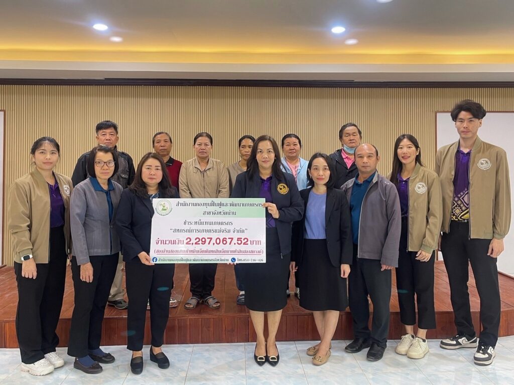 วันที่ 8 มกราคม 2568 เวลา 09.30 น. นางณัติกานต์ บุญเจริญ หัวหน้าสำนักงานกองทุนฟื้นฟูและพัฒนาเกษตรกร สาขาจังหวัดน่าน มอบเงิน จำนวนเงิน 2,297,067.52 บาท ให้กับสหกรณ์การเกษตรแม่จริม จำกัด เพื่อชำระหนี้แทนเกษตรกร อำเภอแม่จริมจำนวน 6 ราย เป็นกรณีหนี้ที่ใช้บุคคลค้ำประกัน โดยมี นางสาวธัญญ์ฐิตา วงษ์เรียบวัฒนา ผู้จัดการสหกรณ์ฯ และนางนิภาพร คำมงคล นักวิชาการสหกรณ์ชำนาญการ เป็นผู้รับมอบเงิน ณ ห้องประชุมสหกรณ์การเกษตรแม่จริมจำกัด อำเภอแม่จริม จังหวัดน่าน
