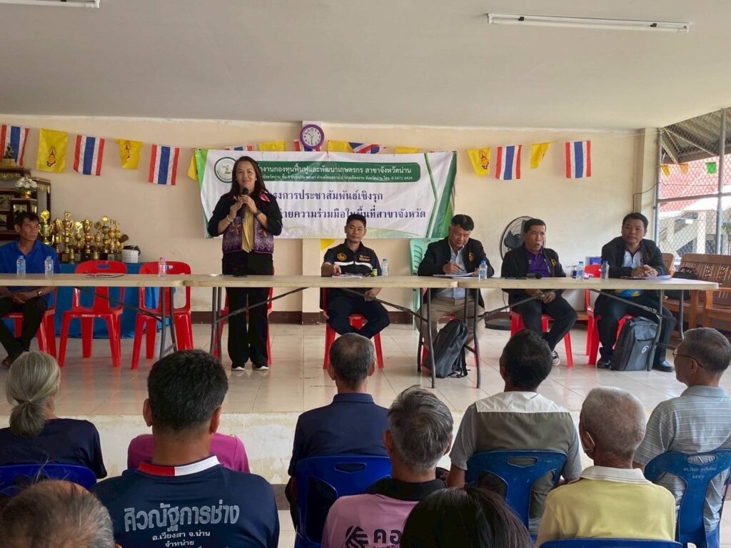 วันที่ 10 เมษายน 2568 เวลา 10.00 น. นางณัติกานต์ บุญเจริญ หัวหน้าสำนักงานกองทุนฟื้นฟูและพัฒนาเกษตรกร สาขาจังหวัดน่าน พร้อมด้วยเจ้าหน้าที่สำนักงานฯ ลงพื้นที่อำเภอท่าวังผา เพื่อประชาสัมพันธ์บทบาทหน้าที่ และภารกิจของสำนักงานกองทุนฟื้นฟูและพัฒนาเกษตรกร ด้านการฟื้นฟูและพัฒนาเกษตรกรและด้านการจัดการหนี้ของเกษตรกร ตามโครงการประชาสัมพันธ์เชิงรุก เพื่อสร้างเครือข่ายความร่วมมือในพื้นที่สาขาจังหวัด โดยมี นายสนิท มณเฑียร รองประธานอนุกรรมการฯ จังหวัดน่านคนที่ 1 นายสุบรรณ นรินทร์และนายสมบูรณ์ ขอคำ อนุกรรมการฯ จังหวัดน่าน เข้าร่วมด้วย ณ หอประชุมบ้านสบขุ่น หมู่ 7 ตำบลป่าคา อำเภอท่าวังผา จังหวัดน่าน