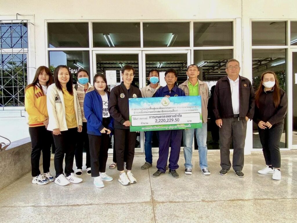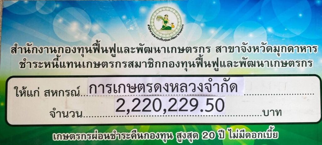 นางสุกัญญา ดำโอ หัวหน้าสำนักงานกองทุนฟื้นฟูและพัฒนาเกษตรกร สาขาจังหวัดมุกดาหาร พร้อมด้วยนางสาวอรทัย ไชยชาติ พนักงานทั่วไป นางปรารถนา โพธิวงศ์ นางสาวสุกัญญา สระแก้ว และนางสาวปิยธิดา รูปหล่อ เจ้าหน้าที่สำนักงาน ดำเนินการมอบเช็คชำระหนี้แทนเกษตรกรสมาชิกกองทุนฟื้นฟูและพัฒนาเกษตรกร ให้แก่ สหกรณ์การเกษตรดงหลวง จำกัด จำนวน 3 ราย เป็นเงิน 2,220,229.50 บาท โดยมีนายสังคม อุปคุณ ประธานสหกรณ์ฯ และผู้จัดการสหกรณ์ฯ เป็นผู้รับมอบ