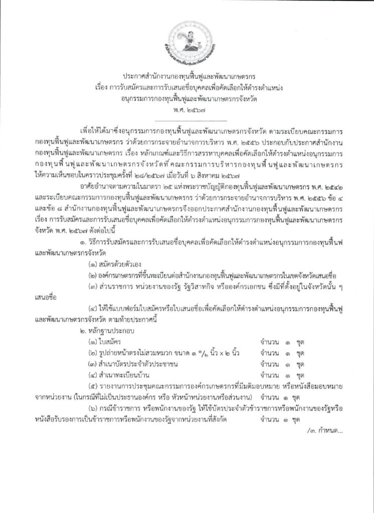 📢ประกาศเรื่อง การรับสมัครและการรับเสนอชื่อบุคคลเพื่อคัดเลือกให้ดำรงตำแหน่งอนุกรรมการกองทุนฟื้นฟูและพัฒนาเกษตรกรจังหวัด