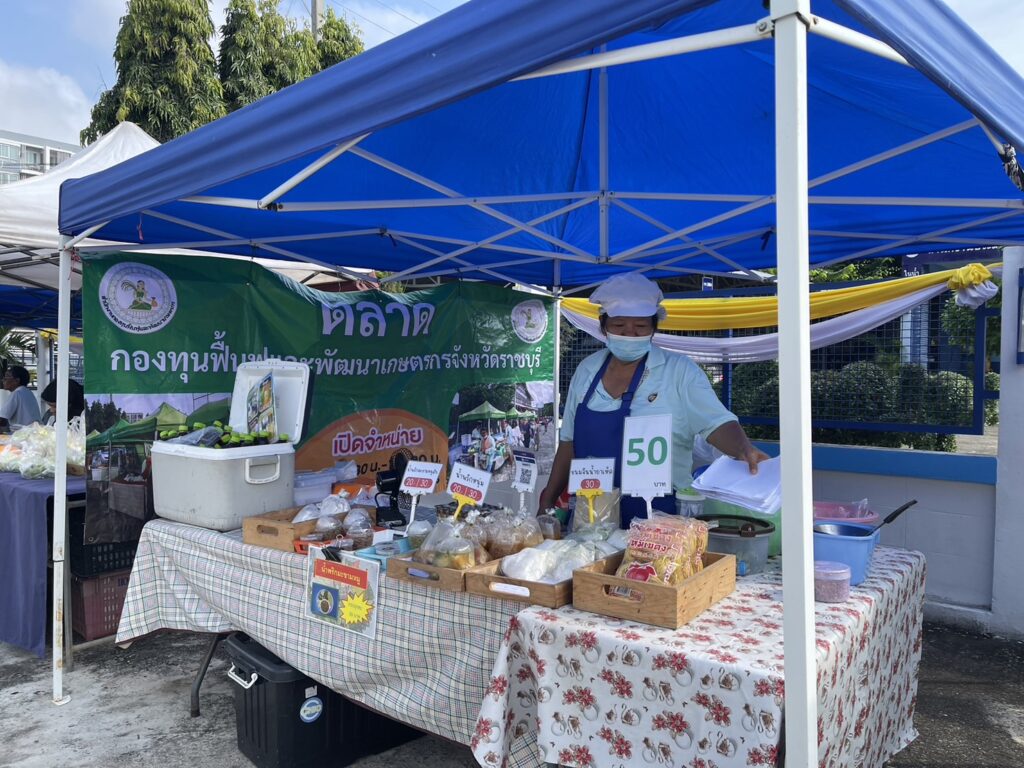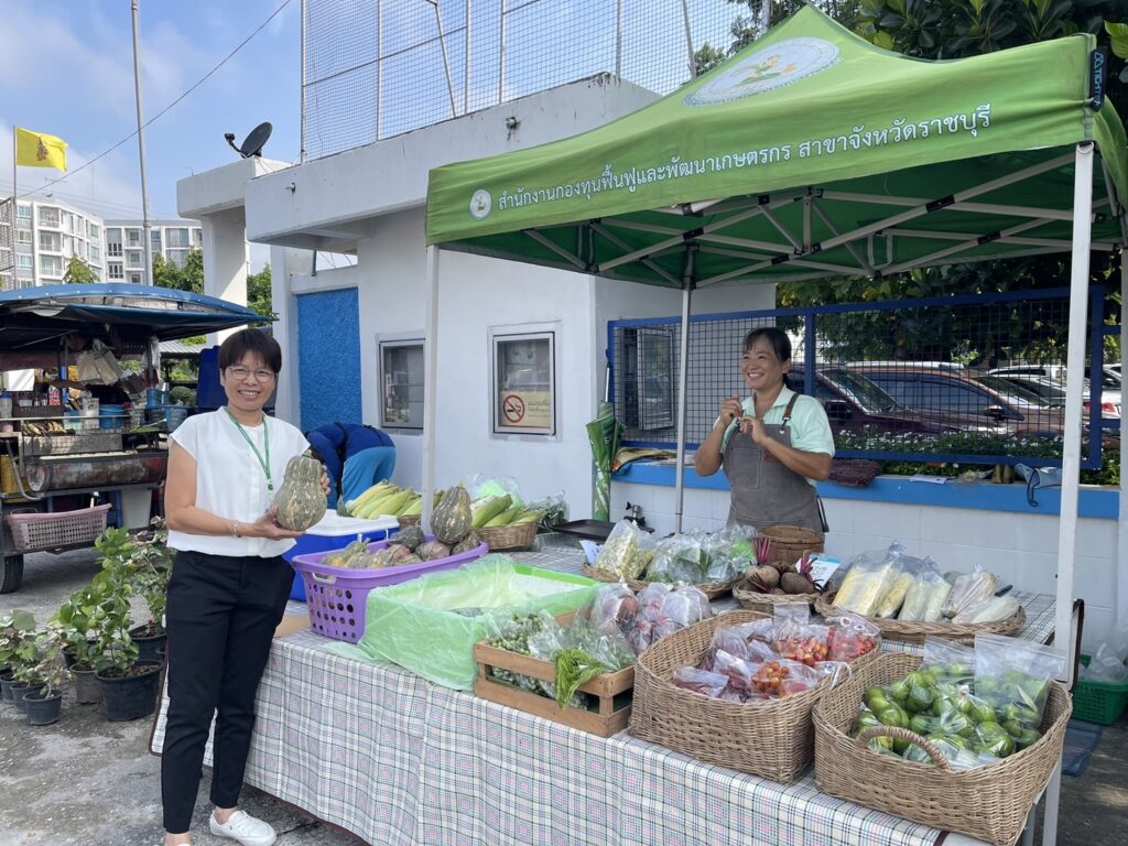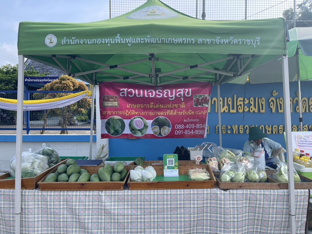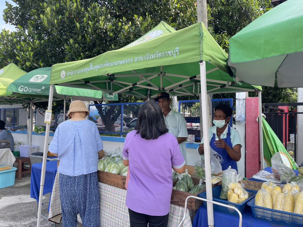 ตลาดกองทุนฟื้นฟูและพัฒนาเกษตรกร จ.ราชบุรี บริเวณทางเท้าหน้าสำนักงานประมงจังหวัดราชบุรี