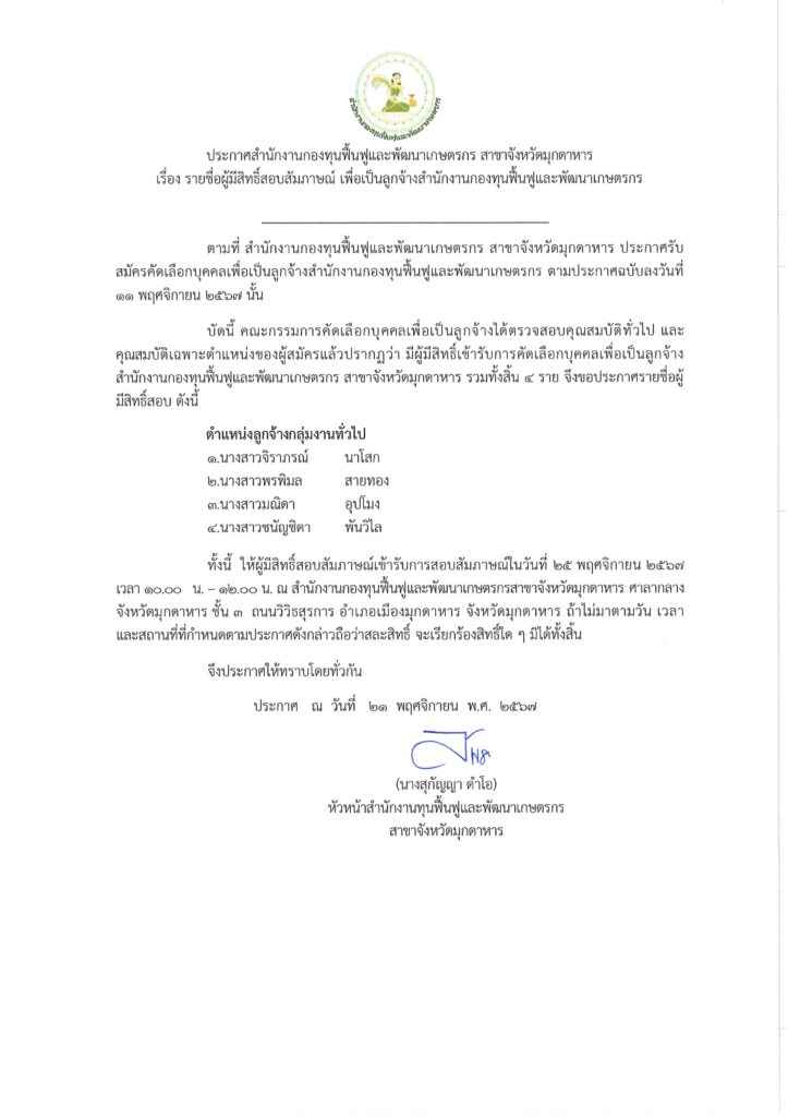 คณะกรรมการคัดเลือกบุคคลเพื่อเป็นลูกจ้างได้ตรวจสอบคุณสมบัติทั่วไป และคุณสมบัติเฉพาะตำแหน่งของผู้สมัครแล้วปรากฏว่า มีผู้มีสิทธิ์เข้ารับการคัดเลือกบุคคลเพื่อเป็นลูกจ้างสำนักงานกองทุนฟื้นฟูและพัฒนาเกษตรกร สาขาจังหวัดมุกดาหาร ให้ผู้มีสิทธิ์สอบสัมภาษณ์เข้ารับการสอบสัมภาษณ์ในวันที่ 25 พฤศจิกายน 2567 เวลา 10.00 น. – 12.00 น. ณ สำนักงานกองทุนฟื้นฟูและพัฒนาเกษตรกรสาขาจังหวัดมุกดาหาร ศาลากลางจังหวัดมุกดาหาร ชั้น 3 ถนนวิวิธสุรการ อำเภอเมืองมุกดาหาร จังหวัดมุกดาหาร ถ้าไม่มาตามวัน เวลา และสถานที่ที่กำหนดตามประกาศดังกล่าวถือว่าสละสิทธิ์ จะเรียกร้องสิทธิ์ใด ๆ มิได้ทั้งสิ้น
