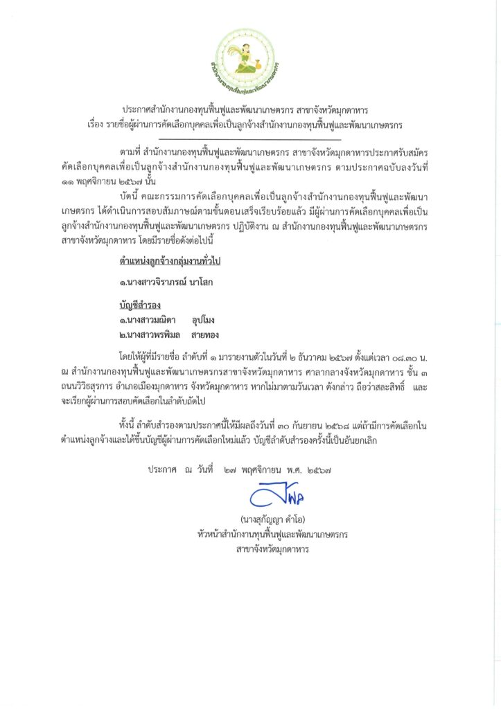 คณะกรรมการคัดเลือกบุคคลเพื่อเป็นลูกจ้างสำนักงานกองทุนฟื้นฟูและพัฒนาเกษตรกร ได้ดำเนินการสอบสัมภาษณ์ตามขั้นตอนเสร็จเรียบร้อยแล้ว มีผู้ผ่านการคัดเลือกบุคคลเพื่อเป็นลูกจ้างสำนักงานกองทุนฟื้นฟูและพัฒนาเกษตรกร ปฏิบัติงาน ณ สำนักงานกองทุนฟื้นฟูและพัฒนาเกษตรกรสาขาจังหวัดมุกดาหาร โดยให้ผู้ที่มีรายชื่อ ลำดับที่ 1 มารายงานตัวในวันที่ 2 ธันวาคม 2567 ตั้งแต่เวลา 08.30 น. ณ สำนักงานกองทุนฟื้นฟูและพัฒนาเกษตรกรสาขาจังหวัดมุกดาหาร ศาลากลางจังหวัดมุกดาหาร ชั้น 3 ถนนวิวิธสุรการ อำเภอเมืองมุกดาหาร จังหวัดมุกดาหาร หากไม่มาตามวันเวลา ดังกล่าว ถือว่าสละสิทธิ์ และ จะเรียกผู้ผ่านการสอบคัดเลือกในลำดับถัดไป