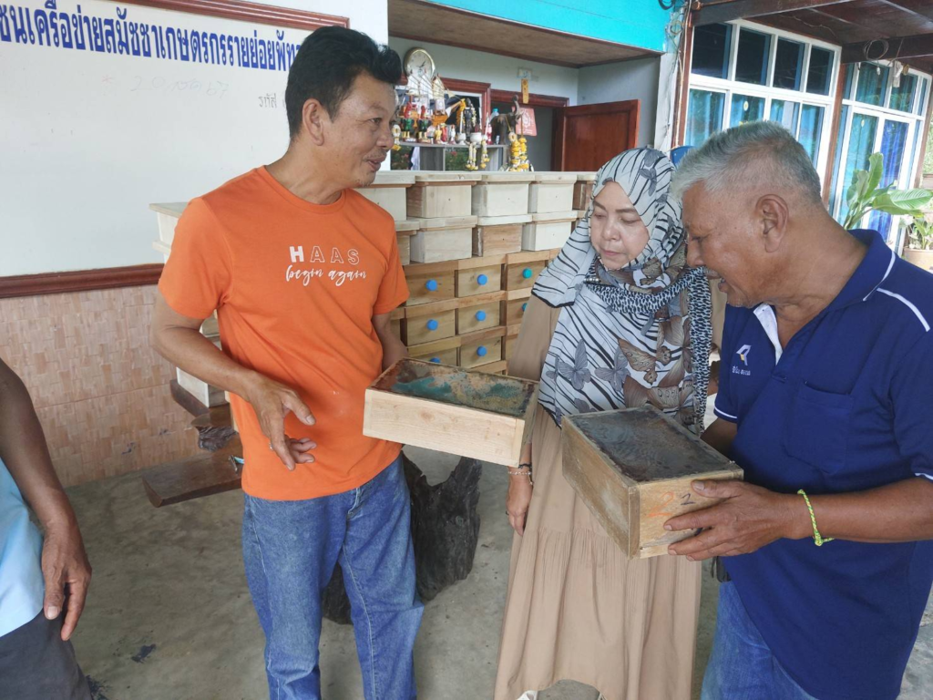 วันที่ 21 ตุลาคม 2567สำนักงานกองทุนฟื้นฟูเเละพัฒนาเกษตรกร สาขาจังหวัดพัทลุง โดย นางสาวนิธิมา บินตำมะหงง หัวหน้าสำนักงานสาขา พร้อมด้วยบุคลากร นางสาวโสพิศ ขวัญนิมิตร พนักงานอาวุโส นายภูชิชย์ สุวรรณสุนทร ลูกจ้างกลุ่มงานทั่วไปและนายศรัณย์ เพชรสง ลูกจ้างกลุ่มงานบริการ ลงพื้นที่ติดตามความก้าวหน้ากลุ่มองค์กรเกษตรกรที่ได้รับงบ ปี 67 (งวดที่ 1) ณ ศูนย์สาธิตวิสาหกิจชุมชนเครือข่ายสมัชชาเกษตรกรรายย่อยพัทลุง โดยเกษตรกรเขียนเเผนโครงการเลี้ยงและจำหน่ายชันโรง โดยจำหน่ายลังสำหรับการขยายพันธุ์ชันโรง เเละจำหน่ายน้ำผึ้งจากชันโรง
