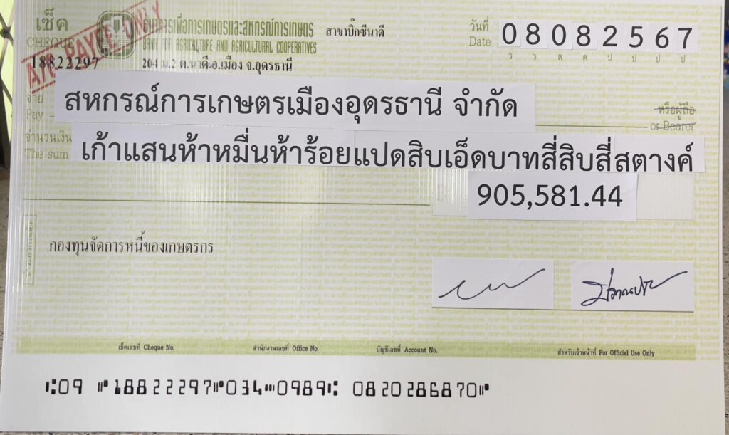 The post ลงพื้นที่มอบเช็คชำระหนี้แทนเกษตรกรสมาชิกกองทุนฟื้นฟูฯ สถาบันเจ้าหนี้ สหกรณ์การเกษตรเมืองอุดรธานี appeared first on สำนักงานกองทุนฟื้นฟูและพัฒนาเกษตรกร สาขาจังหวัดอุดรธานี.