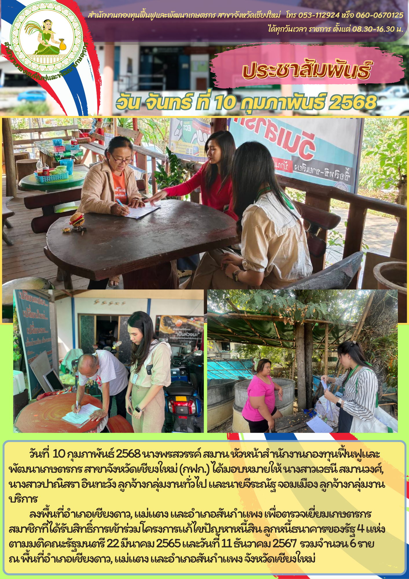 The post วันที่ 10 กุมภาพันธ์ 2568 ลงพื้นที่อำเภอเชียงดาว เพื่อตรวจเยี่ยมเกษตรกรสมาชิกที่ได้รับสิทธิ์การเข้าร่วมโครงการแก้ไขปัญหาหนี้สิน ลูกหนี้ธนาคารของรัฐ 4 แห่ง ตามมติคณะรัฐมนตรี 22 มีนาคม 2565 และวันที่ 11 ธันวาคม 2567 appeared first on สำนักงานกองทุนฟื้นฟูและพัฒนาเกษตรกร สาขาจังหวัดเชียงใหม่.