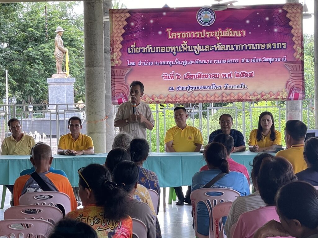 สำนักงานกองทุนฟื้นฟูและพัฒนาเกษตรกร สาขาจังหวัดอุดรธานี โดยมีนายสุริยันต์ เวียงเหล็กธาดา หัวหน้าสำนักงานสาขาจังหวัดอุดรธานี พร้อมนางสาวปราณปรียา ขุลีหา พนักงานทั่วไป นางสาววราภรณ์ คำทะลาด ลูกจ้างกลุ่มงานทั่วไป และลูกจ้างโครงการเร่งรัดฯ พร้อมนายธนดล บุญสิทธิ์ อนุกรรมการฯ ร่วมลงพื้นที่ให้ความรู้ด้านการฟื้นฟูอาชีพของเกษตรกร การขึ้นทะเบียนหนี้ของเกษตรกร สมาชิกกลุ่มปศุสัตว์ดงเย็นขุนขจร ผู้เข้าร่วมประชุมจำนวน 100 คน ณ บ้านดงเย็น ตำบลดงเย็น อำเภอบ้านดุง จังหวัดอุดรธานี