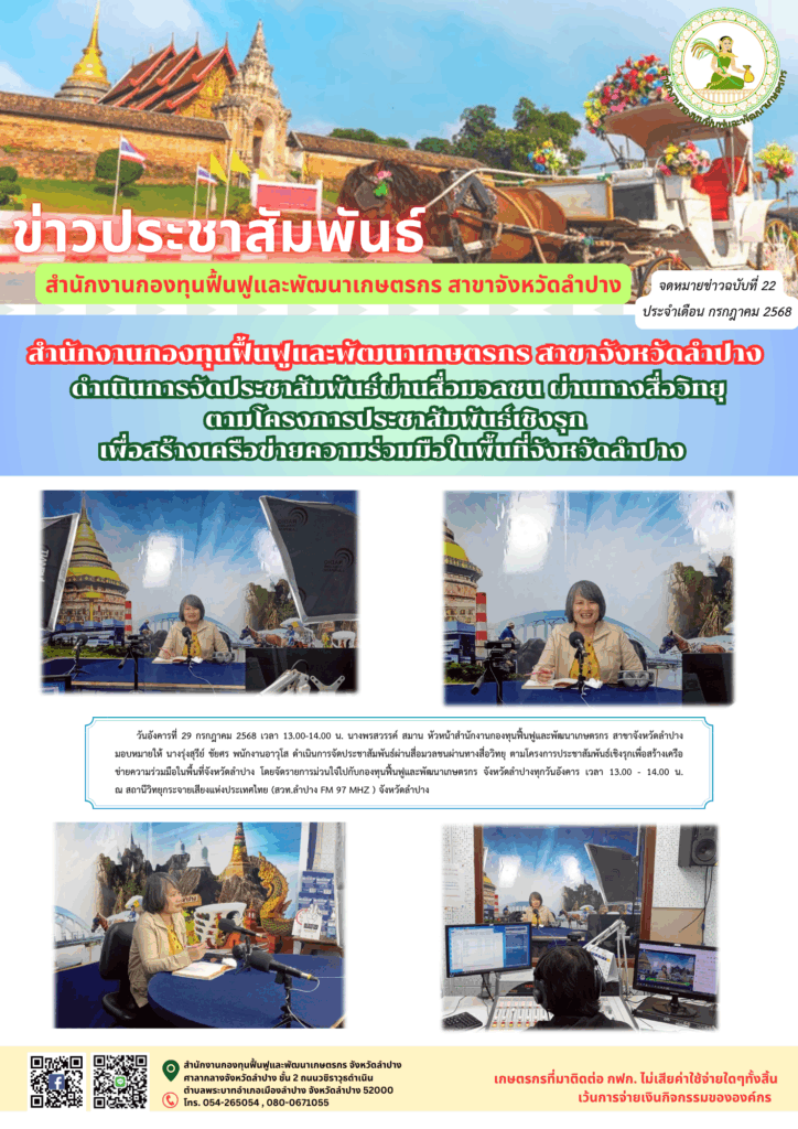 The post สำนักงานกองทุนฟื้นฟูและพัฒนาเกษตรกร สาขาจังหวัดลำปาง ดำเนินการจัดประชาสัมพันธ์ผ่านสื่อมวลชน ผ่านทางสื่อวิทยุตามโครงการประชาสัมพันธ์เชิงรุกเพื่อสร้างเครือข่ายความร่วมมือในพื้นที่จังหวัดลำปาง appeared first on สำนักงานกองทุนฟื้นฟูและพัฒนาเกษตรกร สาขาจังหวัดลำปาง.