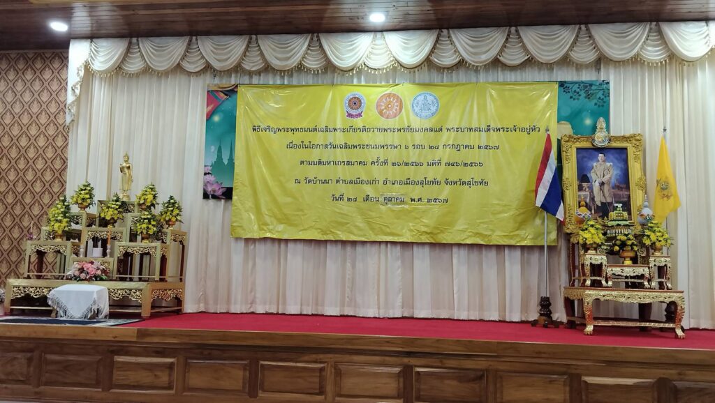 ณ วัดบ้านนา ตำบลเมืองเก่า อำเภอเมืองสุโขทัย จังหวัดสุโขทัย นายนพฤทธิ์ ศิริโกศล รองผู้ว่าราชการจังหวัด รักษาราชการแทนผู้ว่าราชการจังหวัดสุโขทัย เป็นประธานในพิธีเจริญพระพุทธมนต์เฉลิมพระเกียรติถวายพระพรชัยมงคลแด่พระบาทสมเด็จพระเจ้าอยู่หัว เนื่องในโอกาสวันเฉลิมพระชนมพรรษา 6 รอบ 28 กรกฎาคม 2567 โดยมีพระครูสุเมธพัฒโนทัย เจ้าอาวาสวัดไทยชุมพล เจ้าคณะอำเภอเมืองสุโขทัย เป็นประธานฝ่ายสงฆ์ ในการนี้ นางสาวสรินรัตน์ เกิดสกุลรุ่งโรจน์ รองผู้ว่าราชการจังหวัดสุโขทัย นายสมลักษ์ ยกน้อยวงษ์ รองผู้ว่าราชการจังหวัดสุโขทัย หัวหน้าส่วนราชการ และประชาชนเข้าร่วมพิธี