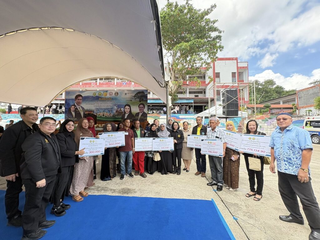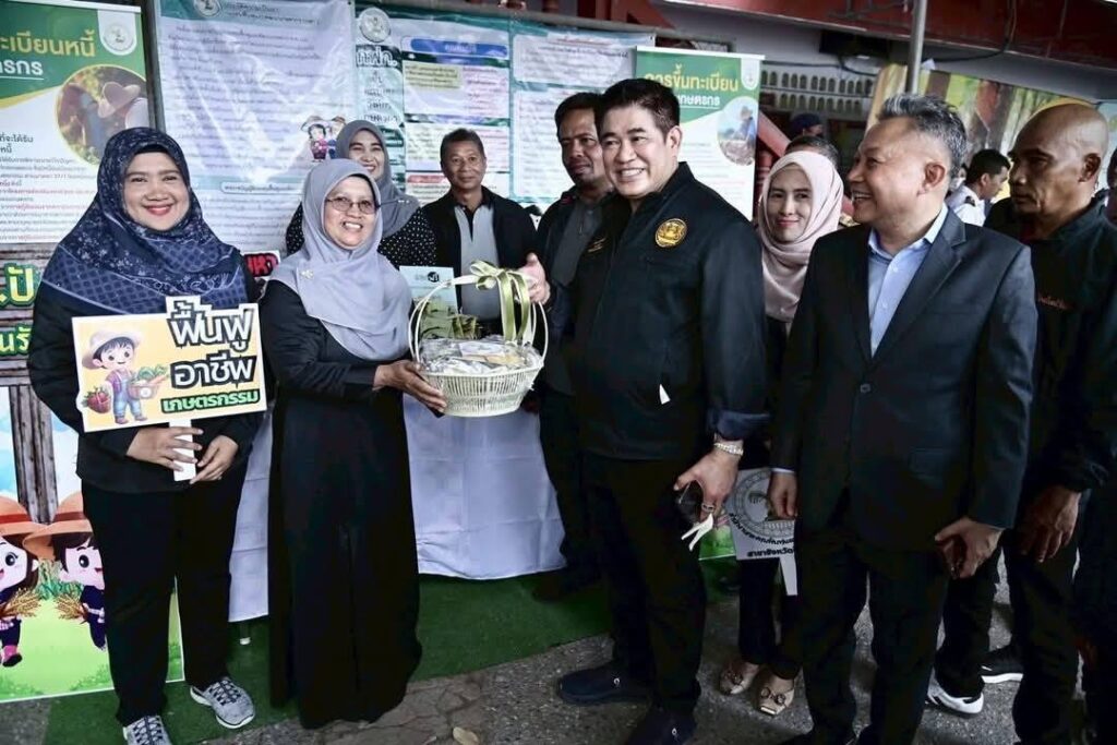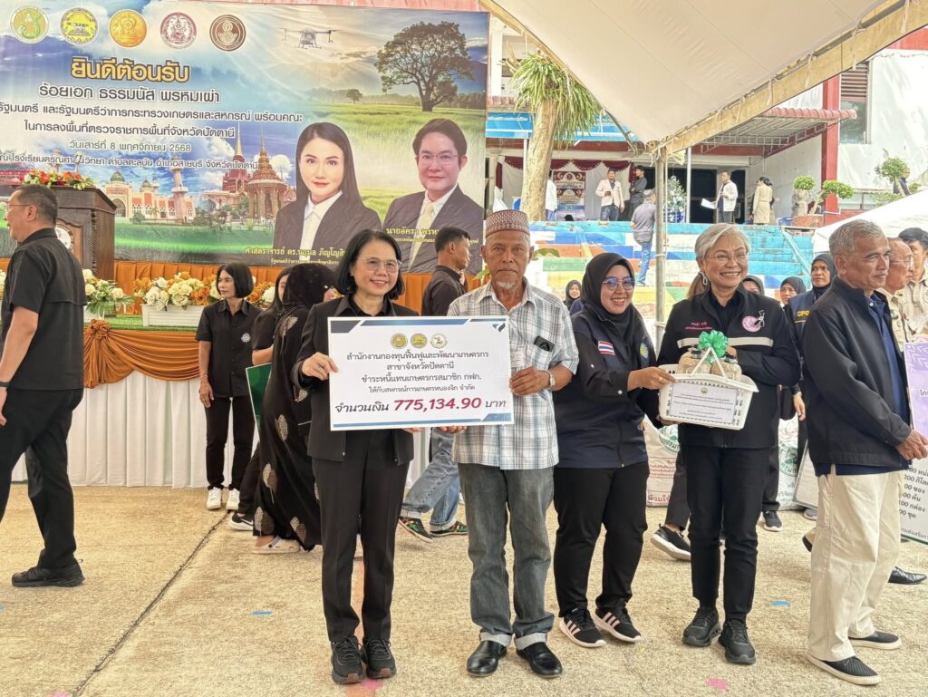 ในช่วงเช้า ที่โรงเรียนดรุณศาสน์วิทยา ต.ตะลุบัน อ.สายบุรี จ.ปัตตานี ได้มอบปัจจัยการผลิตให้กับองค์กรเกษตรกรจำนวน 7 องค์กร รวมมูลค่า 1,906,000 บาท ภายใต้โครงการฟื้นฟูและพัฒนาเกษตรกร แบ่งเป็นเงินกู้ยืมปลอดดอกเบี้ย 6 องค์กร มูลค่า 1,856,000 บาท และงบอุดหนุน 1 องค์กร มูลค่า 50,000 บาท ครอบคลุมโครงการเลี้ยงแกะ ปลูกแตงโมพรีเมี่ยม และเลี้ยงโคพันธุ์พื้นเมือง พร้อมกันนี้ยังได้มอบเช็คชำระหนี้แทนเกษตรกรสมาชิกกองทุนฟื้นฟูฯ ให้กับสหกรณ์การเกษตร 2 แห่ง ได้แก่ สหกรณ์การเกษตรหนองจิก จำกัด วงเงิน 775,134.90 บาท สหกรณ์การเกษตรยะหริ่ง จำกัด วงเงิน 368,448 บาท รวมมูลค่าการชำระหนี้แทนเกษตรกรทั้งสิ้น 1,143,582.90 บาท