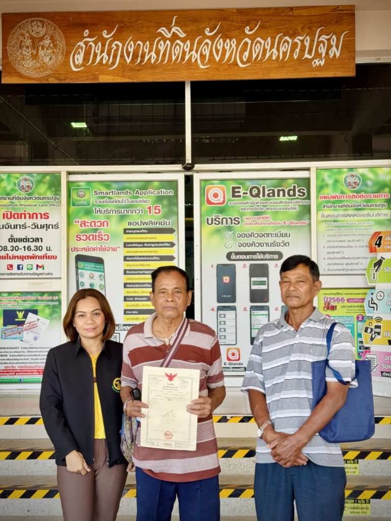 สำนักงานสาขาจังหวัดนครปฐม โดยนางสาวภัทราพร ไวยิ่งยุทธ หัวหน้าสำนักงานฯ ดำเนินการโอนหลักประกันคืนแก่เกษตรกรสมาชิกที่ได้รับการจัดการหนี้ หลังจากปิดบัญชีกับกองทุนฟื้นฟูฯ เรียบร้อยแล้ว จำนวน 1 ราย หลักประกัน 1 แปลง ณ สำนักงานที่ดินจังหวัดนครปฐม