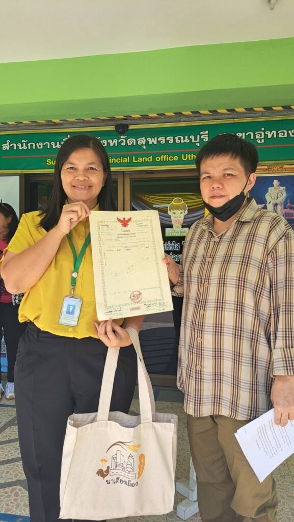 สำนักงานกองทุนฟื้นฟูและพัฒนาเกษตรกร สาขาจังหวัดสุพรรณบุรี โดยนางสาวรัชดา พงษ์ภูมิมาศ หัวหน้าสำนักงานสาขาจังหวัดพิจิตร ปฏิบัติงานแทนหัวหน้าสำนักงานสาขาจังหวัดสุพรรณบุรี ได้โอนกรรมสิทธิ์คืนให้เกษตรกรสมาชิกกองทุนฟื้นฟูและพัฒนาเกษตรกร ที่กองทุนฯชำระหนี้แทนให้เจ้าหนี้เดิม และเกษตรกรทำสัญญาเช่าซื้อกรรมสิทธิ์คืนไปจากกองทุนฯ โดยเมื่อวันที่ 9 ธันวาคม 2567เป็นการโอนกรรมสิทธิ์คืนให้เกษตรกรสมาชิกจังหวัดสุพรรณบุรี ที่ได้ชำระหนี้ปิดบัญชี ครบถ้วนตามสัญญา จำนวน 2 ราย หลักประกันจำนวน 3 แปลง ณ สำนักงานที่ดินจังหวัดสุพรรณบุรี สาขาอู่ทอง
